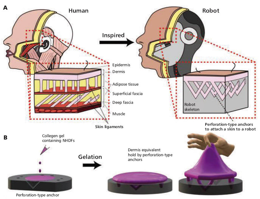 “During previous research on a finger-shaped robot covered in engineered skin tissue we grew in our lab, I felt the need for better adhesion between the robotic features and the subcutaneous structure of the skin,” said Takeuchi. “By mimicking human skin-ligament structures and by using specially made V-shaped perforations in solid materials, we found a way to bind skin to complex structures. The natural flexibility of the skin and the strong method of adhesion mean the skin can move with the mechanical components of the robot without tearing or peeling away.”