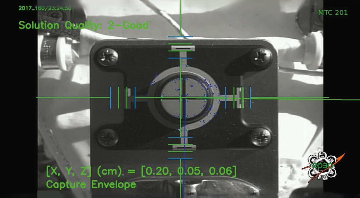 Despite the aid of computer-based models to predict the alignment of both robotic arm and target, iterative realignment procedures were often required to correct botched grapple operations, costing valuable time. To solve this problem, NASA’s computer vision software analyzes the live camera feed from the robotic arms single borescope camera and provides the operator with the delta commands required for an ideal grasp operation.