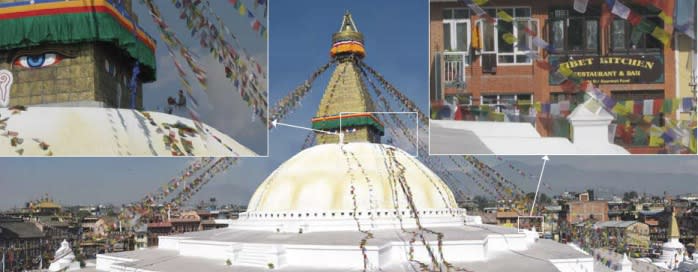 On the Gigapan Web site, a user can display a wide bird’s eye panorama and can then zoom in with impressive bug’s eye high-quality detail. On first impression, a panoramic photograph on Gigapan’s site might seem to be simply a wide-angle cityscape of a temple in Kathmandu. With each successive click, however, the user can zoom deeper and deeper into the photo, revealing more and more clear details: a monk hanging prayer flags on the roof of the temple and the Tibet Kitchen Restaurant and Bar a few blocks behind the temple, with a sign extolling passersby to taste their gourmet food.