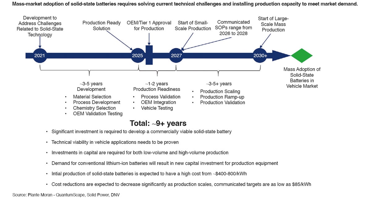 Despite the clear hurdles, most independent analysts agree that new battery technology will come to the market. The question is when. Most estimates range anywhere from five to 15 years. As for who is most likely to step forward first, Plante and Moran’s Lee suspects it will come from a non-OEM startup or supplier. “It could be Tesla or BYD, companies with a strong core competency in battery manufacturing. [The OEMs’] internal capabilities to develop a new chemistry in the lab and bring it to production, I think, are lacking,” he said. “That’s why you see OEMs, via their venture capital arms, making investments into some of these technologies.