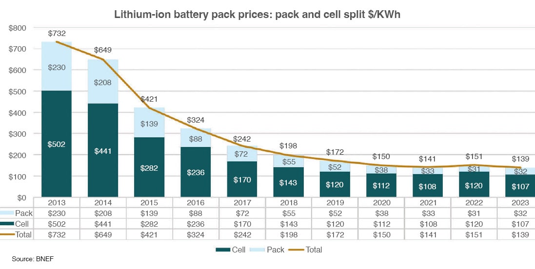 An economy of scale that has driven down the cost per kilowatt-hour from $732 in 2013 to $139 in 2023.