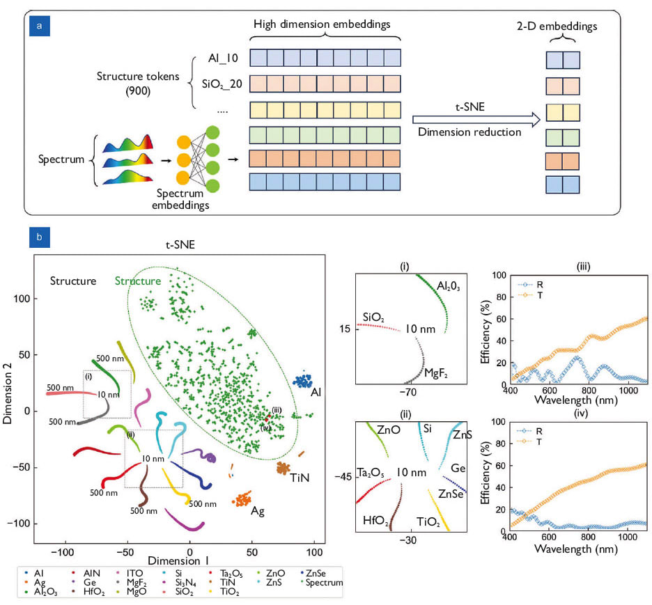 When mapped in a 2D space, materials cluster by type such as metals and dielectric materials, which are electrically insulating but can support an internal electric field. All dielectrics, including semiconductors, converge upon a central point as the thickness approaches 10 nanometers. From an optics perspective, the pattern makes sense as light behaves similarly regardless of material as they approach such small thicknesses, helping further validate OptoGPT’s accuracy.