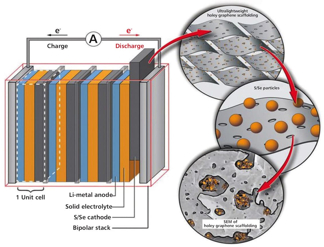 The SABERS innovators developed novel lithium-sulfur designs, including sulfur-selenium on graphene cathodes, and lightweight bipolar plate stacking and packaging designs. SABERS is unique in several aspects: it deploys graphene-based manufacturing processes for the cathode and bipolar plates, and it uses a solid-state electrolyte in place of the liquid electrolyte found in other lithium-sulfur battery designs. The team has achieved energy densities over 500 W-hr/kg, and further improvements are expected. SABERS can meet the high-power requirements needed for aircraft take-off. SABERS is lightweight, safe, robust, and reliable. Furthermore, its manufacturing processes are scalable and environmentally friendly. Coin cell and pouch prototypes have been demonstrated to date.