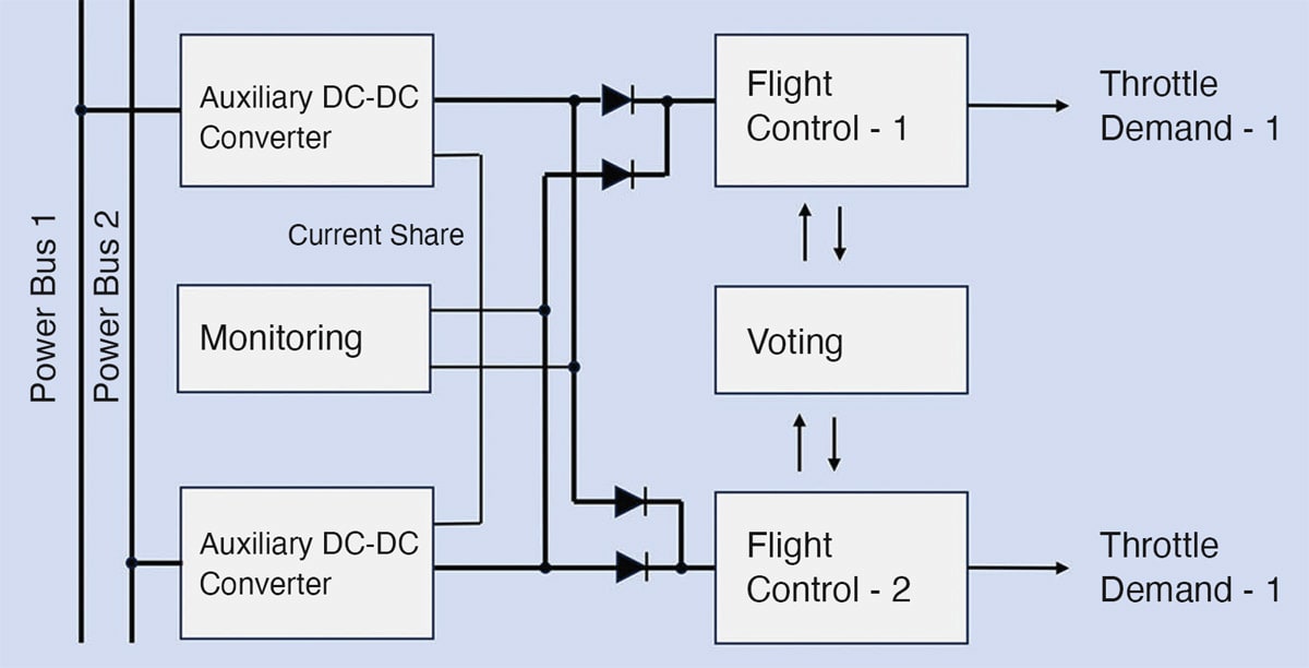 In this case, monitoring has to have the intelligence to detect if each DC-DC output is valid and if a gating diode fails short, which might not be otherwise noticed. If this happens, a DC-DC that fails with a shorted output to ground would drag down the supply to both flight control systems in the example of figure 1. In the figure, if the input of the ‘flight control’ block goes short, this would also take down both DC-DC outputs so a fuse or circuit breaker would be necessary in each power line.