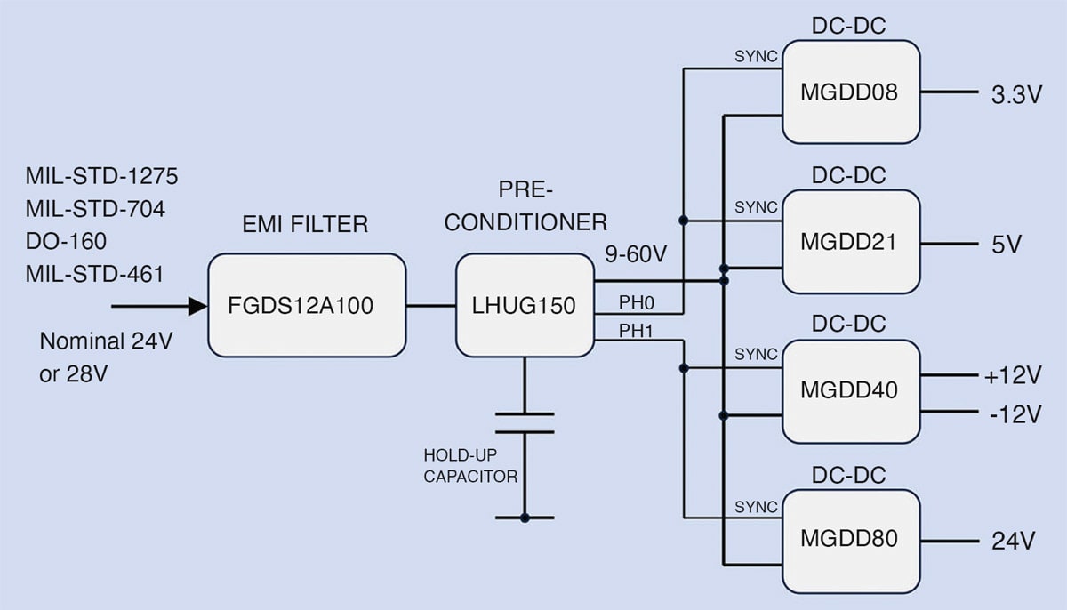 An EMC filter, part FGDS12A100, enables compliance with military standard MIL-STD-461 while the pre-conditioner module LHUG150 attenuates spikes and surges according to MIL-STD-1275, while providing active hold-up with supply dips from an external capacitor. This is kept ‘boosted’ up to a high voltage, whatever the input. The module handles loads up to 150W total at nominal voltages between 9-60VDC and incorporates reverse polarity protection, inrush control and soft start. Synchronization signals in two anti-phases are also generated for the downstream converters.