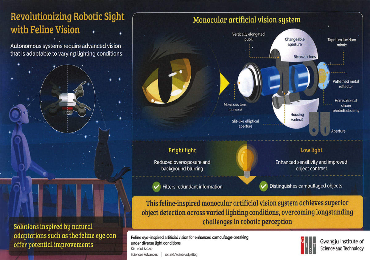 A group of Korean researchers led by Professor Young Min Song from Gwangju Institute of Science and Technology (GIST) designed a new vision system that uses an advanced lens and sensors inspired by feline eyes. The system includes a slitlike aperture that, like a cat’s vertical pupil, helps filter unnecessary light and focus on key objects. It also uses a special reflective layer similar to the one found in cat eyes that improves visibility in low-light conditions.