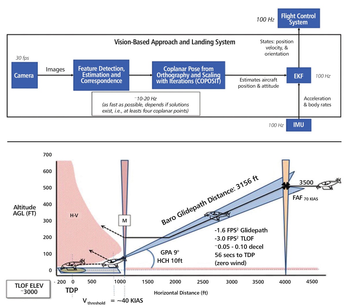 The technology employs an aircraft-mounted camera to visually detect known features in the landing area, using a computer vision method called Coplanar Pose from Orthography and Scaling with Iterations (COPOSIT) to determine the position and orientation of the aircraft relative to the features detected from the camera images, and an extended Kalman filter to predict and correct the estimated position, velocity, and orientation of the aircraft.