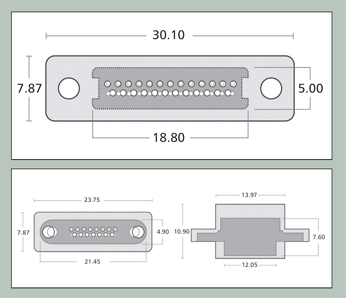 We can see this if we overlay the traditional Micro-D connector with a modern equivalent, for example a 26-pole Gecko connector with a 1.25 mm pitch onto a 25-way Micro-D equivalent (as per Figure 3a). Measuring 18.80×5.00 mm (94 mm2), the 26-pole thermoplastic connector has a footprint that is just over 60 percent smaller than the Micro-D equivalent.