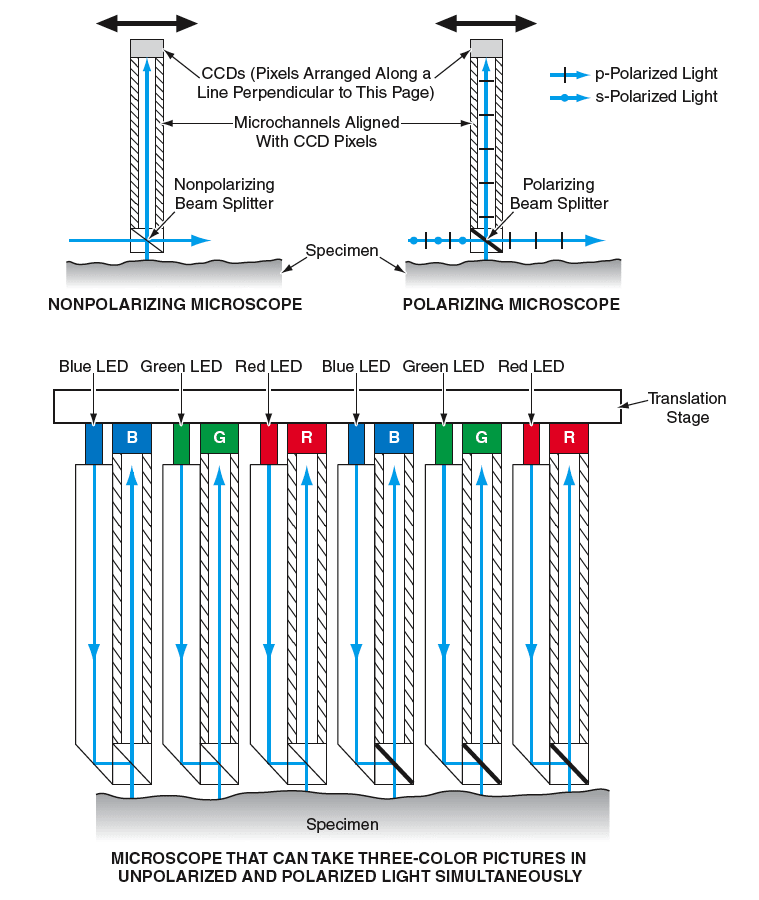 The scanning microscopes described above could be used as building blocks for a multicolor, multipolarization microscope. In the example shown in the figure, six scanning microscopes would be assembled on a single translation stage. The microchannels would be interspersed with light sources that would comprise light-emitting diodes (LEDs) coupled to the beam splitters via prismlike light guides.