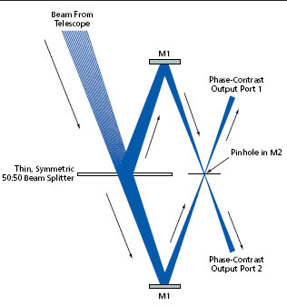 Figure 2 schematically illustrates an optical assembly, according to the proposal, for implementing the 90°-phase-shift filter needed in a phase-contrast sensor like that of Figure 1. An incident beam from a telescope would strike a 50:50 beam splitter. The reflected and transmitted beams would be recombined by an arrangement of mirrors, schematically represented by flats M1 in Figure 2; one component is directed through a diffraction- limited pinhole in two-sided mirror M2. The pinhole would pass the central ˜?/D portions of the beams, while the M2 surfaces surrounding the pinhole would reflect the off-axis portions. The total beam going to the output port on each side of M2 would comprise the desired combination of central rays and 90°-shifted off-axis rays. The output beams could be directed into telescope-pupil-re-imaging optics equipped with a chargecoupled- device (CCD) or similar quantum detector, as in Figure 1. Optionally, the phase-contrast images contained in both beams could be combined optically or electronically to increase the signal-to-noise ratio.