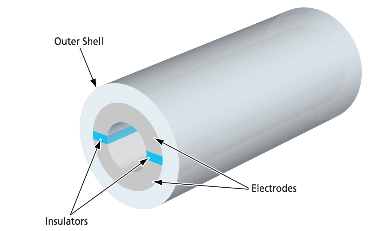 The figure depicts a device for measuring the electrical conductivity of a flowing liquid. Unlike prior such devices, this one does not trap gas bubbles entrained in the liquid.