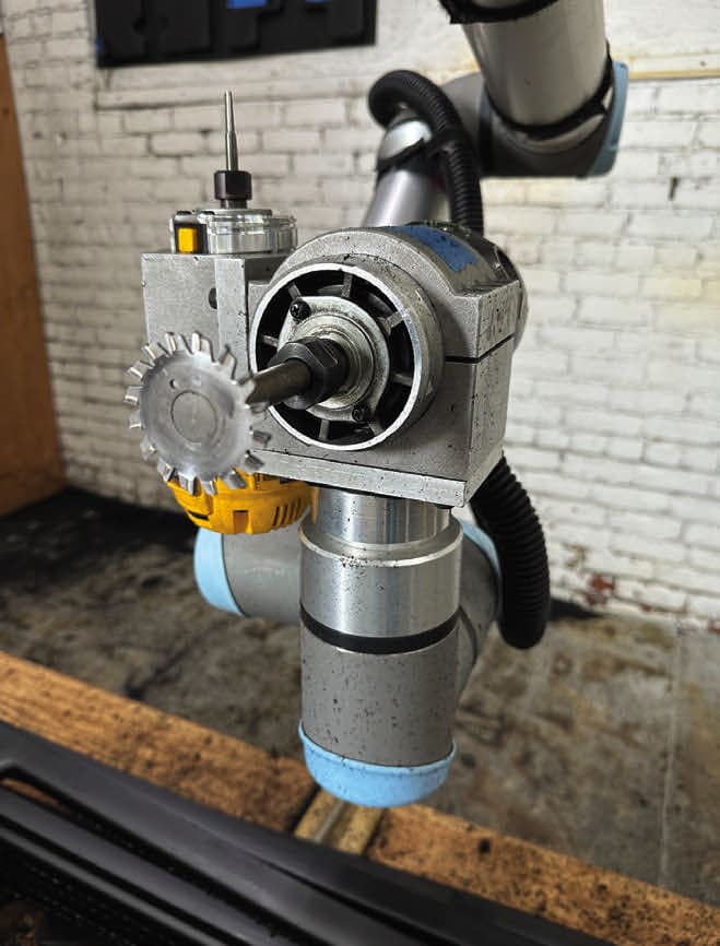 The deployment has two routers mounted on the robot arm — one with a standard router bit and one with a larger saw blade. The advantage is that the routers are the same commercial tools used for hand trimming. They are inexpensive and available off-the-shelf at any hardware store. Balancing the two heavy routers as they rotated around the part presented early challenges that were solved by mounting the robot arm overhead on a gantry to reduce pressure on the robot joints and improve accuracy.