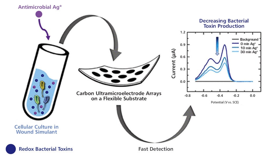 For the new study, the researchers built an early prototype of an electroanalytical wound sensor based on carbon ultra-microelectrode arrays (CUAs) on flexible substrates. In previous studies, this sensor had been placed on quartz substrates, but to ensure flexibility, the authors developed a method of putting the arrays on a polyethylene terephthalate (PET) substrate.