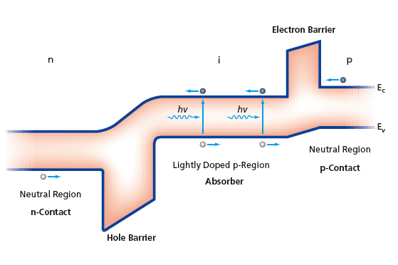 Previously, THALES Research and Technology (France) demonstrated detectors with bulk InAsSb (specifically InAs0.91Sb0.09) absorber lattice-matched to GaSb substrates. The absorber is surrounded by two wider bandgap layers designed to minimize impedance to photocurrent flow. The wide bandgap materials also serve as contacts. The cutoff wavelength of the InAsSb absorber is fixed. CBIRD may be considered as a modified version of the THALES double heterostructure (DH) p-i-n device, but with even wider bandgap barriers inserted at the contact layer/absorber layer interfaces. It is designed to work with either bulk semiconductors or superlattices as the absorber material. The superlattice bandgap can be adjusted to match the desired absorption cutoff wavelength.