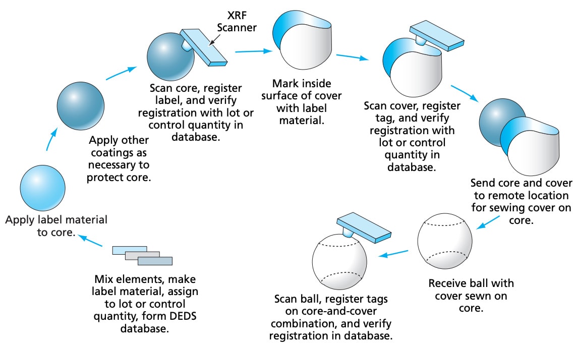 In another potential application (see figure), an ECPIAS would be used to track softballs. Softball cores and covers are typically manufactured in the United States and shipped offshore where the covers are sewn on. At present, in order to verify the origin of a shipment of assembled softballs returning to the United States, it is necessary to take some balls as samples, cut their covers off, and examine their cores. In contrast, the ECPIAS would make it possible to verify the origin of the balls quickly and nondestructively. The ECPIAS concept could also be applied to other products in which XRF labels could be permanently encased. Examples include balls used in high-profile sports, tires, printed-circuit components, layered clothing items (e.g., shoes), and critical aircraft components.