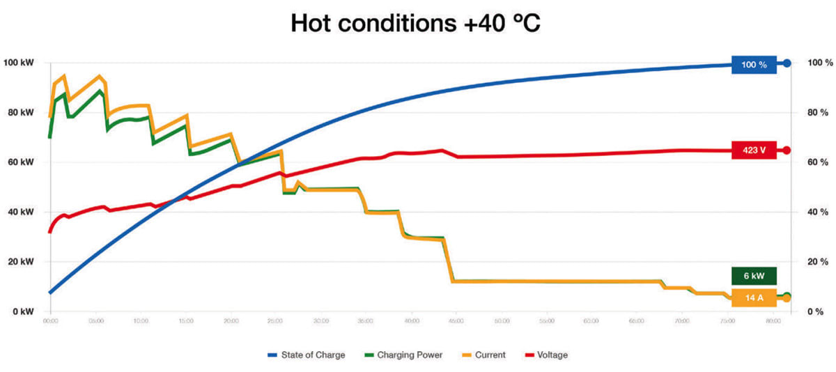 At the other end of the scale, charging times at +40 °C ranged from 40 to 43 minutes, depending on factors such as whether or not the air conditioning was activated inside the cabin.