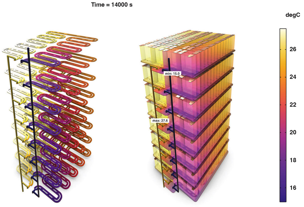 The example model shown in Figure 2 looks at the effects of liquid cooling for 56 cells. This model can incorporate capacity loss and be used to visualize the aging effects on the design and determine which design alteration best mitigates these effects.