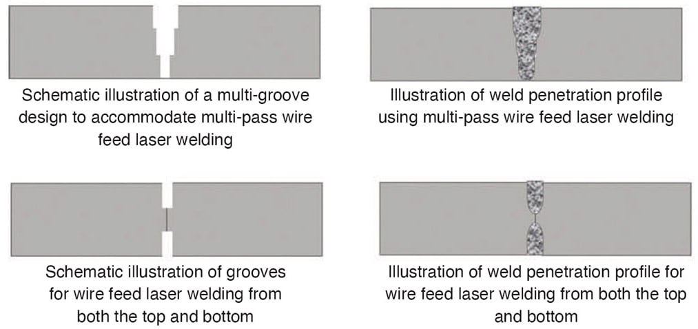 To make the process more accurate, tactile wire feed laser welding (a method that involves sensors or mechanical feedback systems to guide wire placement and ensure precise delivery into the weld pool) uses laser energy and a filler wire to create strong and precise welds. This technique is especially useful in jobs that require tight tolerances and consistent quality. This method often requires a groove in the workpiece to ensure proper alignment and penetration of the weld. A groove helps guide the filler wire into the weld pool, allowing for precise placement and consistent quality. The filler wire, on the other hand, should closely match the chemical composition of the base metal to ensure that the weld area has similar mechanical and thermal properties to the base metal. Otherwise, it can lead to problems like poor weld quality, weakness, or even cracking in the weld. The mismatch might also cause the weld to be more prone to corrosion or failure over time.