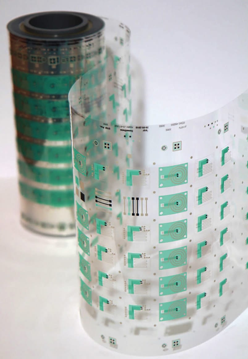 The new sensors contain a spiraling microscopic tube, or microfluidic, that wicks sweat from the skin. By tracking how fast the sweat moves through the microfluidic, the sensors can report how much a person is sweating or their sweat rate. The microfluidics are also outfitted with chemical sensors that can detect concentrations of electrolytes like potassium and sodium and metabolites like glucose. Roll-to-roll processing enables high-volume production of disposable patches at low cost.