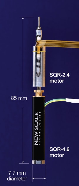 The array of 2,400 Cobra optic fiber positioners contains two SQUIGGLE custom rotary piezoelectric motors, which were developed specifically for this purpose by New Scale Technologies. Working with JPL’s design requirements, New Scale optimized the miniature rotary motor for high torque over 3.0 mN m and step size less than 0.065º. Each theta-phi style Cobra fiber positioner includes one 4.4 × 4.4 mm and one 2.5 × 2.5 mm SQUIGGLE motor, with one offset from the other, allowing the optic fiber to be placed anywhere in a small circular patrol region. The patrol diameter of the actuator is large enough to obtain 100% sky coverage of the close-packed hex array pattern of positioners.