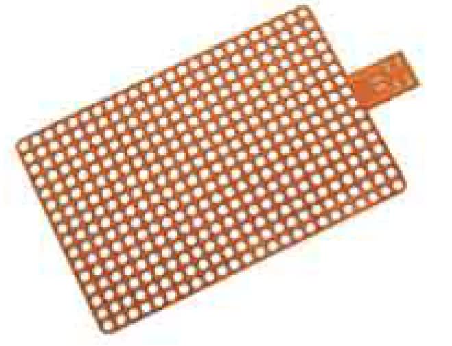 The well holes are trimmed using laser technology that enables extremely tight hole-to-hole tolerance. This allows for accurate registration of the heater to the PCR sample block. The laser trimming process can provide a tight positional tolerance of ±0.002" (0.05mm), which is more accurate than steel rule dies and other trimming techniques. The net effect for the PCR application is that the heater aligns with the sample block and cuvette tray/microplate. Equally important, the reaction process can be viewed without infringement by the heater. Thin and flexible, the construction of the 384-hole heater can save valuable space. Typical heater thickness ranges from 0.005" (0.13mm) to 0.012" (0.3mm). The minimum bend radius is 0.030"(0.8mm). The heater is constructed with a polyimide substrate. Pressure-sensitive adhesive (PSA), epoxy, factory lamination, or a mechanical clamp can be used to affix the polyimide heater to a heatsink.