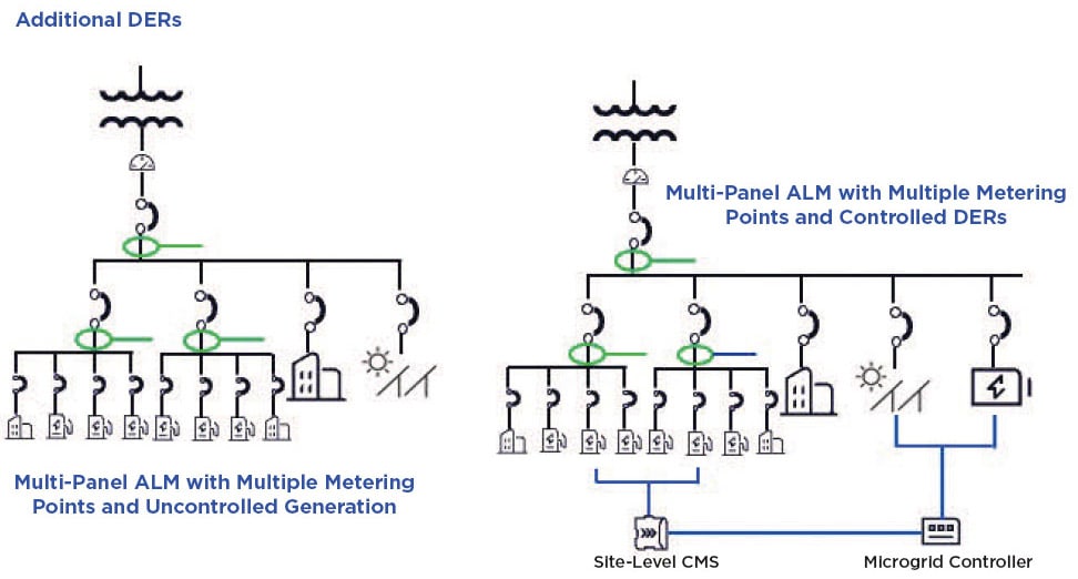 The next level of load management is the ability to control EV load across multiple electrical panels while respecting all controlling equations. For example, in its simplest form, a site might have two subpanels with a group of EV chargers on each, feeding into a main service panel and connected to a single interconnection. In this case, the CMS must be able to solve a system of three equations, one per panel. The CMS must be able to process all equations at once, limiting charging load to each subpanel’s capabilities, and continuously respecting the main panel’s limit ( Figure 3).