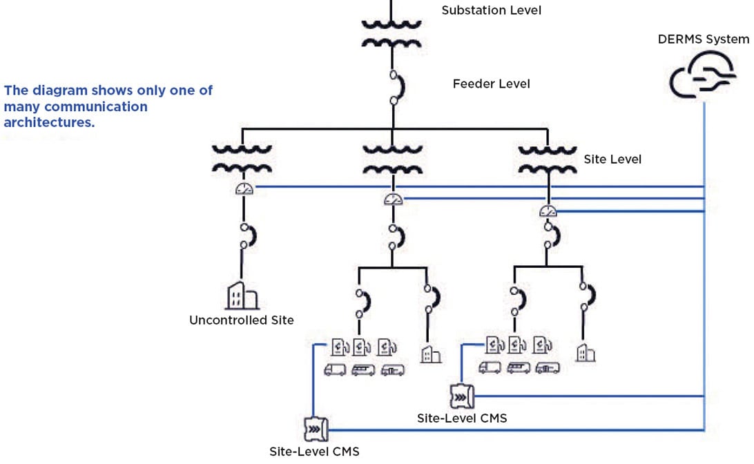 For fleets at power-constrained sites, there may come a point at which the load management options previously described cannot service the entire fleet’s charging needs, and the operator may consider adding on-site energy generation. In those cases, the CMS can integrate with uncontrolled or controlled distributed energy resources (DERs), such as solar, stationary storage, or a backup generator to add local power supply to avoid total reliance on grid power.