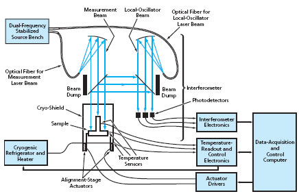 The dilatometer (see figure) includes a common-path, differential, heterodyne interferometer; a dual-frequency, stabilized source bench that serves as the light source for the interferometer; a cryogenic chamber in which one places the material sample to be studied; a cryogenic system for cooling the interior of the chamber to the measurement temperature; an ultra-stable alignment stage for positioning the chamber so that the sample is properly positioned with respect to the interferometer; and a data-acquisition and control system. The cryogenic chamber and the interferometer portion of the dilatometer are housed in a vacuum chamber on top of a vibration-isolating optical table in a cleanroom. The sample consists of two pieces — a pillar on a base — both made of the same material. Using reflections of the interferometer beams from the base and the top of the pillar, what is measured is the change in length of the pillar as the temperature in the chamber is changed.