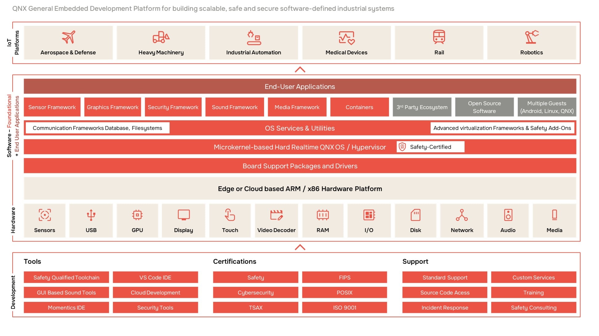 QNX OS for Safety comes with a fully featured hard, real-time OS based on the QNX Software Development Platform 8.0 and certified to ISO 26262 ASIL D, IEC 61508 SIL 3, and IEC 62304 Class C, and ISO/SAE 21434 safety and security standards.