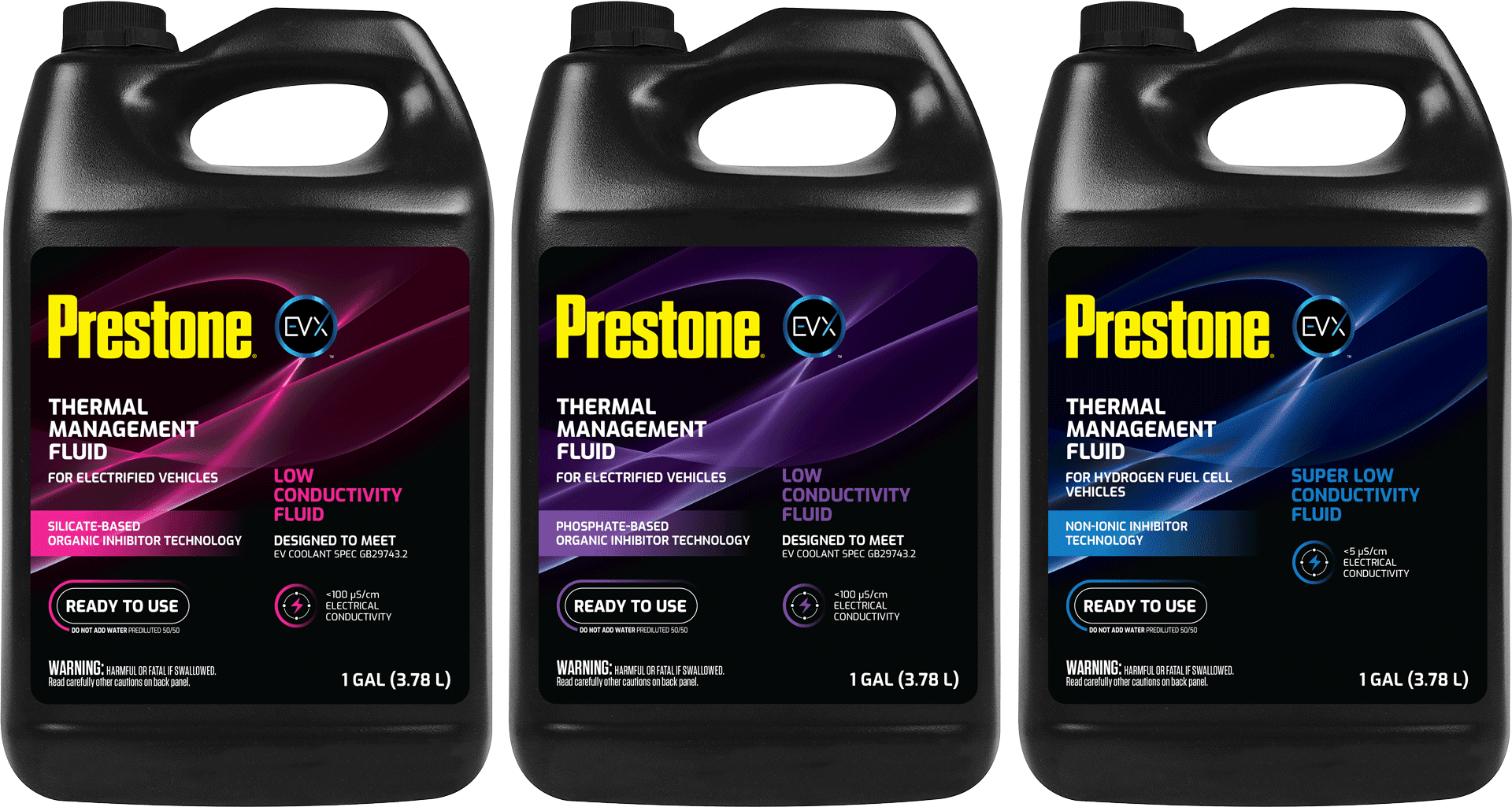 - Prestone EVX™ Phosphate-based organic inhibitor technology: A low conductivity phosphate organic acid technology thermal management fluid, delivering exceptional corrosion protection for EVs without relying on silicate, borate, or amine.
