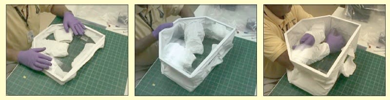 To prepare the glove box for use, the astronaut or other user has merely to insert hands through the two fabric glove ports in the side walls of the box and move two hinges to a locking vertical position (see figure). The user could do this while seated with the glove box on the user’s lap. When stowed, the glove box is flat and has approximately the thickness of two pieces of 8-in. (≈20 cm) polycarbonate.