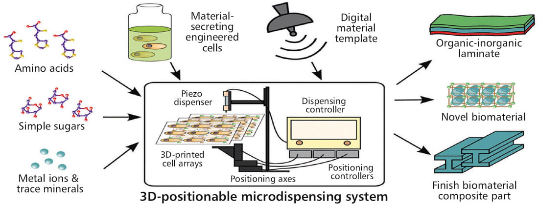 Once genes for a desired material type, delivery mode, control method and affinity have been chosen, assembling the genetic components and creating the cell lines can be done with well-established synthetic biology techniques. A 3D microdeposition system is used to make a 3D array of these cells in a precise, microstructure pattern, and shape.