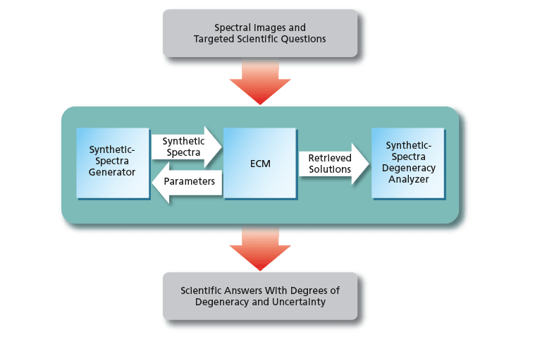 The ECM framework consists of three main components: the central core (ECM), a Synthetic Spectra Generator that produces a population of spectral solutions, and a Synthetic Spectra Degeneracy Analyzer that assesses the uniqueness of these solutions. This structure enables the retrieval of multiple statistically significant solutions, addressing the issue of solution degeneracy and enhancing the interpretation of Earth science and planetary data.