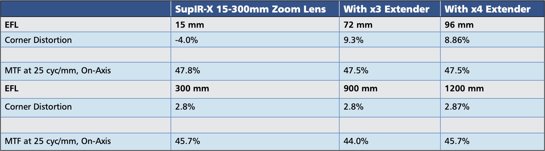 Crucially, the designs of the extenders have been carefully crafted so that they produce almost no degradation in image contrast or stability — a necessity for their use in C-UAS detection. This is demonstrated in Table 1 which compares the on and off-axis performance with and without the extenders. Plus, even with the extenders in use, the lens maintains boresight accuracy, fast focus response (<1 s), and stable line-of-sight throughout the entire zoom range.