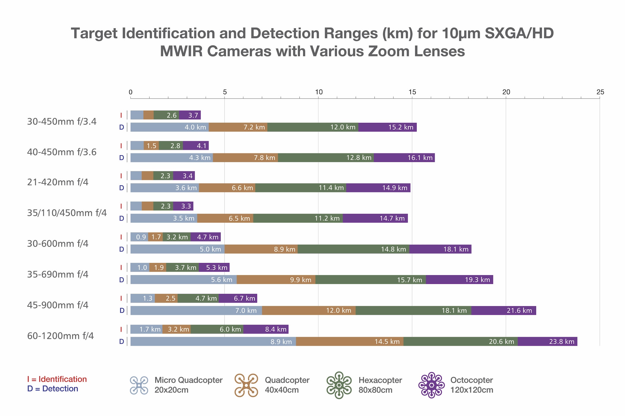 Each step in the DRI hierarchy requires that the image of a target occupy progressively move pixels on the detector. Assuming the distance from camera to target stays fixed, this translates into a longer lens focal length at each step. Thus, the ideal C-UAS lens offers multiple focal lengths to enable it to transition from surveying a wide area (for target detection) to higher magnifications (for positive identification). Figure 1 summarizes the detection and identification ranges of various focal length lenses for four typical C-UAS targets.