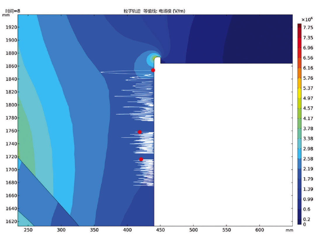 The movement of the particles under the combined effect of the electric field and the insulating gas flow field is extremely complex, difficult to predict, and challenging to observe with the naked eye. If these particles adhere to the insulator surface, it will lead to changes in the surrounding electric field, triggering gas breakdown and affecting the insulation performance of the insulator. To address these issues, Pinggao Group used multiphysics simulation to evaluate the forces acting on the particles and their moving trajectory (Figure 3).