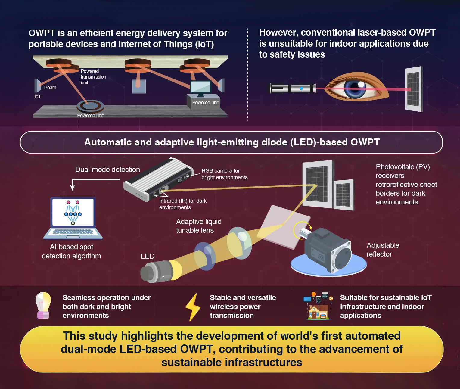 The world’s first automatic and adaptive, dual-mode light-emitting diode (LED)-based optical wireless power transmission system, that operates seamlessly under both dark and bright lighting conditions, has been developed by scientists at Science Tokyo. The system, along with artificial intelligence-powered image recognition, can efficiently power multiple devices in order without interruption. Because it is LED-based, it offers a low-cost and safe solution ideal for building sustainable indoor Internet of Things infrastructure.