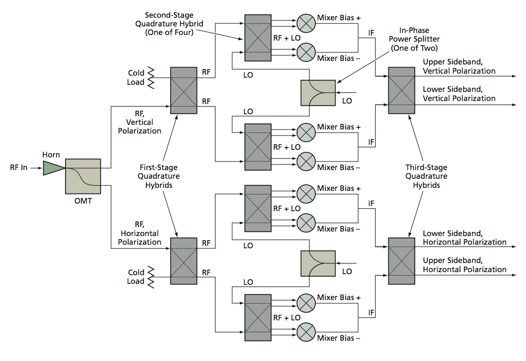 Figure 1. The 1.5-THz Dual-Polarization, Sideband-Separating Receiver would process an incoming RF signal into an upper- and a lower-sideband output for each of two orthogonal polarizations. The receiver architecture (see Figure 1) as proposed is based on discrete single-ended mixers and conventional waveguides with integrated planar circuitry. The receiver would include a finline orthomode transducer (OMT) followed by six quadrature hybrids on a plane (see Figure 2). An incoming radio-frequency (RF) signal would enter via a horn antenna. An ortho- mode transducer (OMT) would separate the incoming RF signal into its two orthogonal linearly polarized components. One of the outputs will go through a waveguide polarization twist and that will enable the subsequent components to have the same E-field orientation. Each of these polarizations would be fed to a first-stage quadrature hybrid. The outputs of each first-stage quadrature hybrid, which would be in phase quadrature, would be fed along with a local-oscillator (LO) signal to two second-stage quadrature hybrids. The combined LO and RF signals coming out of the second-stage quadrature hybrids would pump two sets of mixers in a balanced configuration. The intermediate-frequency (IF) outputs of the mixers would be combined in third-stage quadrature hybrids to separate the upper and lower sidebands for each polarization.