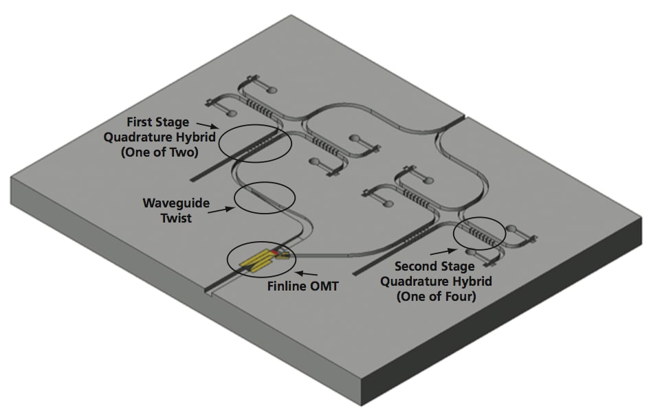 Figure. 2. A schematic diagram of the One Half of the Split-Block for the broadband 1.5 THz dual-polarized, sideband-separating, balanced receiver shows the finline OMT, two first-stage and four second-stage quadrature hybrids, and the in-phase LO power splitter that will be fabricated using DRIE silicon etching process. The critical components in the planned development of the proposed receiver would be the OMT, the first- and second-stage quadrature hybrids, and the polarization twist. Previously, it was almost impossible to design, simulate, and fabricate such components for operation at terahertz frequencies: because of the smallness of their features and the tightness of their tolerances, quadrature hybrids and finline OMTs for terahertz frequencies cannot be fabricated by conventional machining. However, recent advances in both electromagnetic-field-simulating software and microfabrication techniques have made it possible to design and construct complexly shaped waveguide structures. The development of the proposed receiver is planned to include the use of a combination of optical lithography and a micromachining process based on deep reactive ion etching (DRIE) of silicon. This combination is expected to enable the realization of micron-size waveguide features and sub-micron tolerances in fabricating the aforementioned critical components.