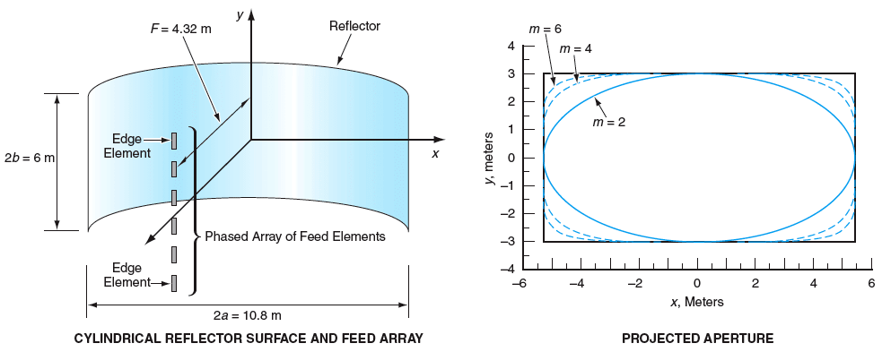 The basic antenna geometry (see figure) is that of a parabolic cylindrical reflector. The cylindrical axis is the y axis, and the geometric boresight axis is the z axis. The phased array of feed elements lies on the focal line, which is parallel to the y axis, at a distance F from the apex of the parabola. The boundary of the reflector and thus of the aperture, as projected onto the x,y plane, is specified by the superquadric curve