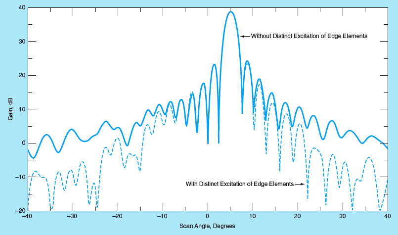 where an is the magnitude of the excitation, and a is the progressive phase (that is, the phase difference between adjacent elements) needed to point the main lobe of the radiation beam in a given direction in the (y,z) plane. For an edge radiating element, the excitation coefficient would be of the form