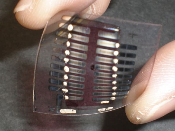 New Energy Technologies’ solar cells have the same electrical properties as silicon, but have considerably better capacity to ‘optically absorb’ photons from light to generate electricity. Transparency is achieved by use of conducting polymers. Each solar array is composed of a series of twenty ultra-small solar cells measuring less than a quarter of the size of a grain of rice each. The ultra-thin film is only 1/1000th the thickness of a human hair, or 1/10th of a micrometer. The organic solar cells are fabricated using environmentally-friendly hydrogen-carbon based materials.