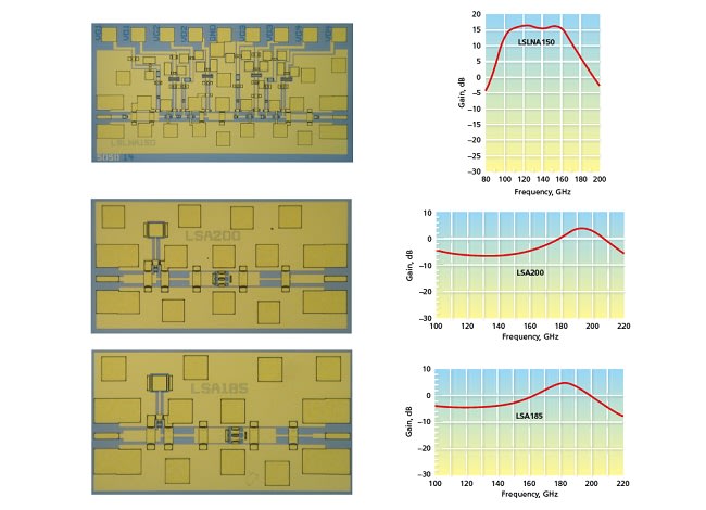 The LSA200 and the LSA185 are intended to be prototypes of transmitting power amplifiers for use at frequencies between about 180 and about 200 GHz. These amplifiers have also been fabricated according to rules of the aforesaid commercial product line of InP HEMT MMICs, except that the HEMTs in these amplifiers are characterized by a gate geometry of 4 fingers, each 37 μm wide. The measured peak performance of the LSA200 is characterized by a gain of about 1.4 dB at a frequency of 190 GHz; the measured peak performance of the LSA185 is characterized by a gain of about 2.7 dB at a frequency of 181 GHz. The measured gain results of each chip are shown next to their respective photos.