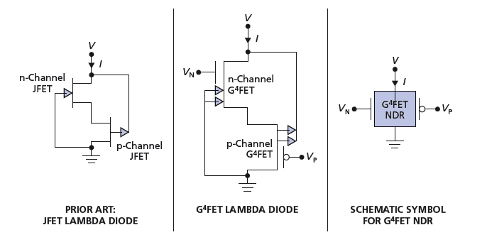 It is possible to synthesize a voltage-controlled negative-differential-resistance (NDR) device or circuit by use of a pair of complementary G4FETs (four-gate field-effect transistors). [For more information about G4FETs, please see "G4FET Implementations of Some Logic Circuits" (NPO-44007).] As shown in Figure 1, the present voltage-controlled NDR device or circuit is an updated version of a prior NDR device or circuit, known as a lambda diode, that contains a pair of complementary junction field-effect transistors (JFETs). (The lambda diode is so named because its current-versus-voltage plot bears some resemblance to an uppercase lambda.) The present version can be derived from the prior version by substituting G4FETs for the JFETs and connecting both JFET gates of each G4FET together. The front gate terminals of the G4FETs constitute additional terminals (that is, terminals not available in the older JFET version) to which one can apply control voltages VN and VP.