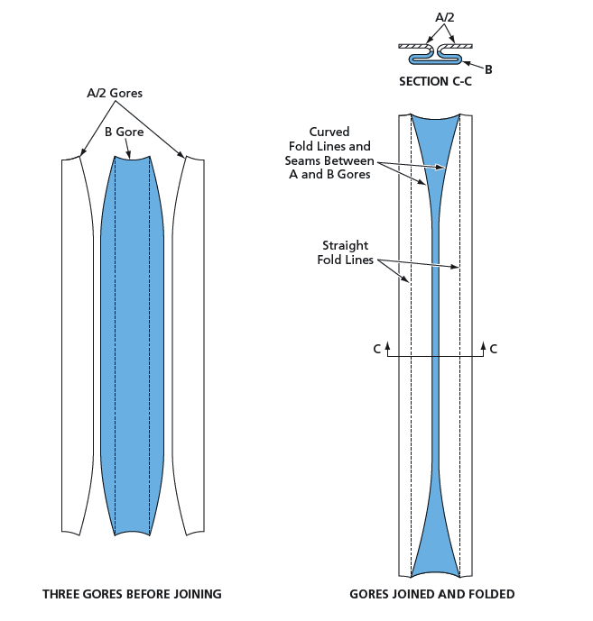 The equations also provide for simplification of fold lines in double-curvature regions. For example, in the original application, the basic repeating unit for forming a cylinder with toroidal end caps consists of a gore designated B between two gores designated A/2, as shown in the figure. The B gore contains two straight fold lines that run the entire length, including the toroidal regions at the ends. The seams between the A/2 and B gores constitute a second pair of fold lines that are curved in the end regions, the curvature being such as to enable the flat folded pattern to deploy to the desired toroidal shape at the ends. When repeating units are joined together at vehicle installation, adjacent A/2 gores become a full A gore.