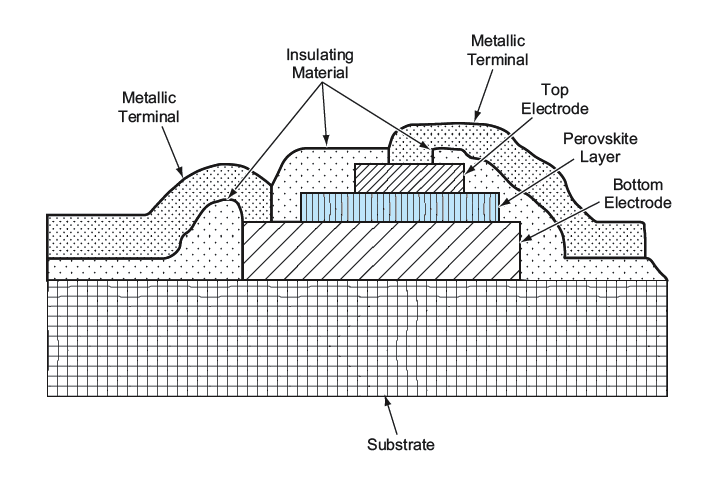 Figure 1. An Electrically Variable Capacitor of the type described in the text can be fabricated on a silicon or other substrate as part of an integrated circuit. A capacitor of this type is a simple two-terminal device. It includes a thin film of a suitable perovskite as the dielectric layer, sandwiched between two metal or metal oxide electrodes (for example, see Figure 1). The utility of this device as a variable capacitor is based on a phenomenon, known as electrical-pulse-induced capacitance (EPIC), that is observed in thin perovskite films and especially in those thin perovskite films that exhibit the colossal magnetoresistive (CMR) effect. In EPIC, the application of one or more electrical pulses that exceed a threshold magnitude (typically somewhat less than 1 V) gives rise to a nonvolatile change in capacitance. The change in capacitance depends on the magnitude duration, polarity, and number of pulses. It is not necessary to apply a magnetic field or to cool the device below (or heat it above) room temperature to obtain EPIC. Examples of suitable CMR perovskites include Pr1–xCaxMnO3, La1–xCaxMnO3, La1–xSrxMnO3, and Nb1–xCaxMnO3.