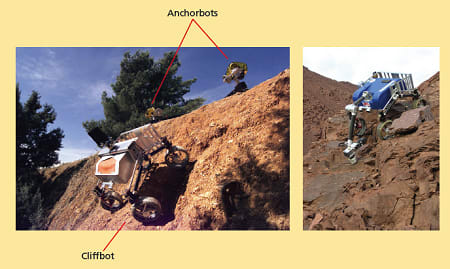 Teamed Robots for Exploration and Science in Steep Areas (TRESSA) is a system of three autonomous mobile robots that cooperate with each other to enable scientific exploration of steep terrain (slope angles up to 90°). Originally intended for use in exploring steep slopes on Mars that are not accessible to lone wheeled robots (Mars Exploration Rovers), TRESSA and systems like TRESSA could also be used on Earth for performing rescues on steep slopes and for exploring steep slopes that are too remote or too dangerous to be explored by humans.
