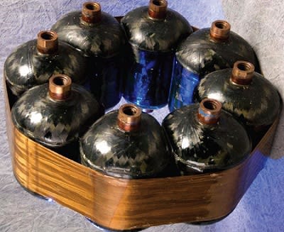 The figure shows a prototype assembly of conformal tanks. Each tank was fabricated by (1) copper plating a wax tank mandrel to form a liner and (2) wrapping and curing layers of graphite/epoxy composite to form a shell supporting the liner. In this case, the conformal tank surfaces are flat ones where they come in contact with the adjacent tanks. A band of fibers around the outside binds the tanks together tightly in the assembly, which has a quasi-toroidal shape. For proper functioning, it would be necessary to maintain equal pressure in all the tanks.