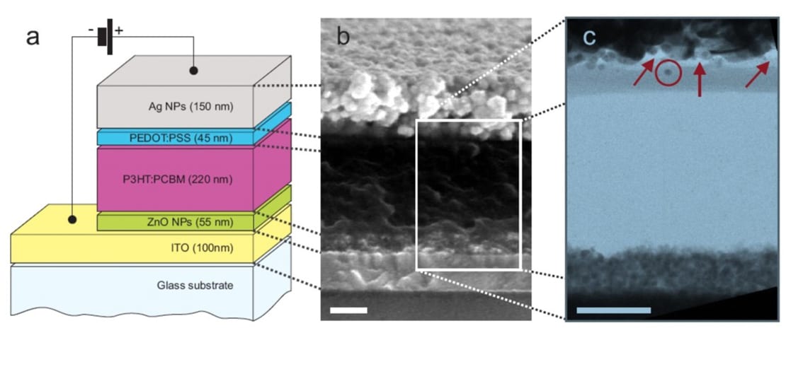 The active layer deposited with spray-coating that showed power conversion efficiencies above 3% was a solution of P3HT and PCBM. The metal top contact was spray-coated with a solution containing silver nanoparticles. IMEC demonstrated that spray-coating greatly reduces the damage to underlying layers compared to other techniques. The silver nanoparticles were sintered at 150°C, a temperature that is compatible with processing on flexible substrates.