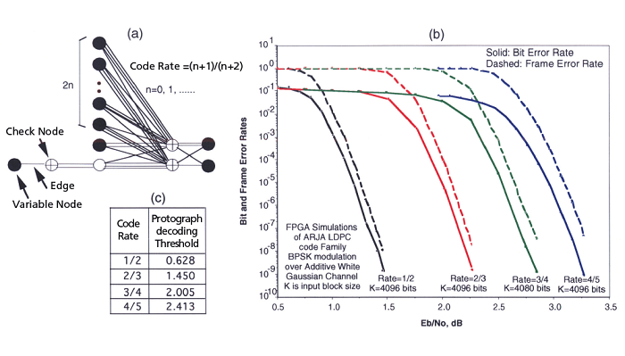 As an example, the illustration shows the protograph (which represents the blueprint for overall construction) of one proposed code family for code rates greater than or equal to 1/2. Any size LDPC code can be obtained by copying the protograph structure N times, then permuting the edges. The illustration also provides Field Programmable Gate Array (FPGA) hardware performance simulations for this code family. In addition, the illustration provides minimum signal-to-noise ratios (Eb/No) in decibels (decoding thresholds) to achieve zero error rates as the code block size goes to infinity for various code rates. In comparison with the codes mentioned in the preceding article, these codes have slightly higher decoding thresholds.